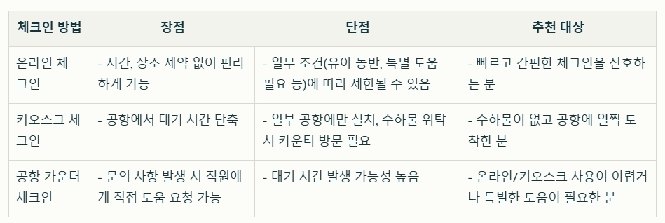 다양한 체크인 옵션 활용: 온라인, 키오스크, 공항 카운터 등 자신에게 맞는 최적의 방법을 선택하여 편리함을 극대화할 수 있습니다.